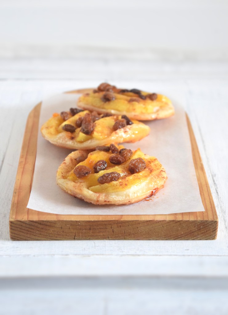 Ritagliate la pasta sfoglia a dischi, utilizzando un cutter o un bicchiere. Spennellate i dischi con la marmellata, sistemate sopra mele e uvetta – ricordandovi di asciugare le mele dal succo che a questo punto verrà eliminato. Cospargete le sfoglie con qualche granello di zucchero e cannella. Cuocete in forno ventilato a 180 gradi per circa 20 minuti.