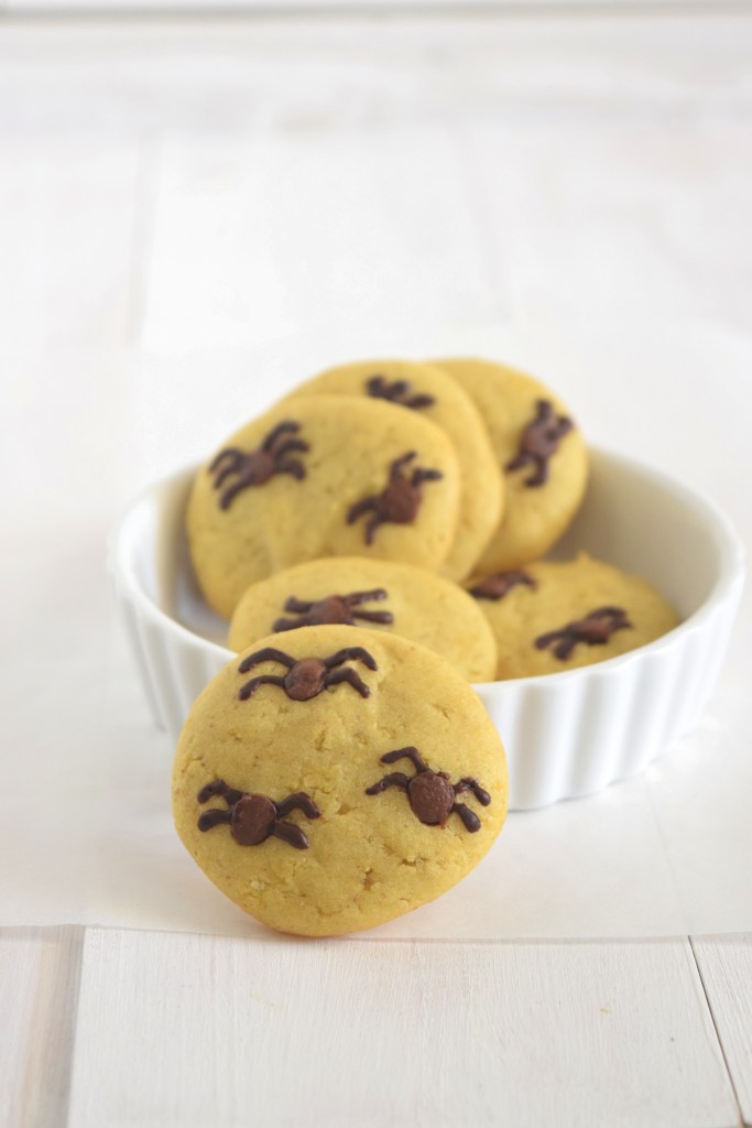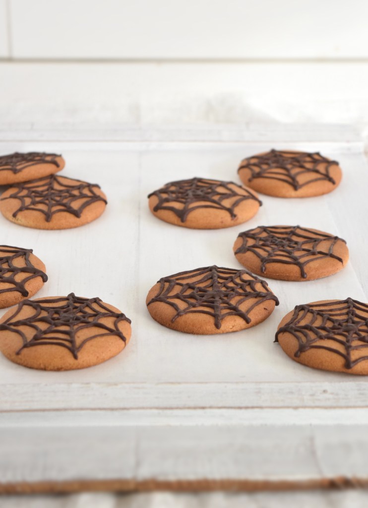 Ora, se volete decorare i biscotti, prendete le gocce di cioccolato e posizionatene 3-4 in ogni biscotto, facendo sì che la parte con la punta della goccia penetri nel biscotto, con una leggera pressione. Lasciate un po’ di spazio tra una goccia e l’altra così da avere spazio poi per decorare i ragnetti.