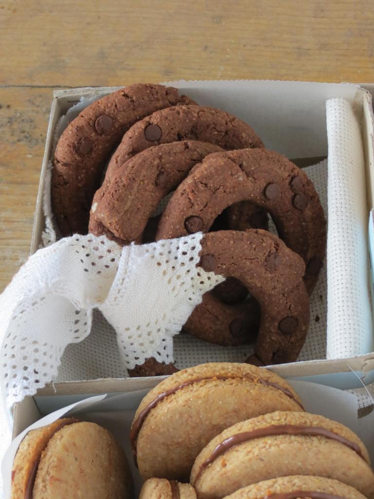 Biscotti al cacao e gocce di cioccolato: unite all’impasto il cacao ed impastate con pazienza per dare colore. Aggiungete le gocce di cioccolato. Create dei serpentini con la pasta e poi create delle ciambelle. Disponetele sulla banda del forno a fianco degli altri biscotti.