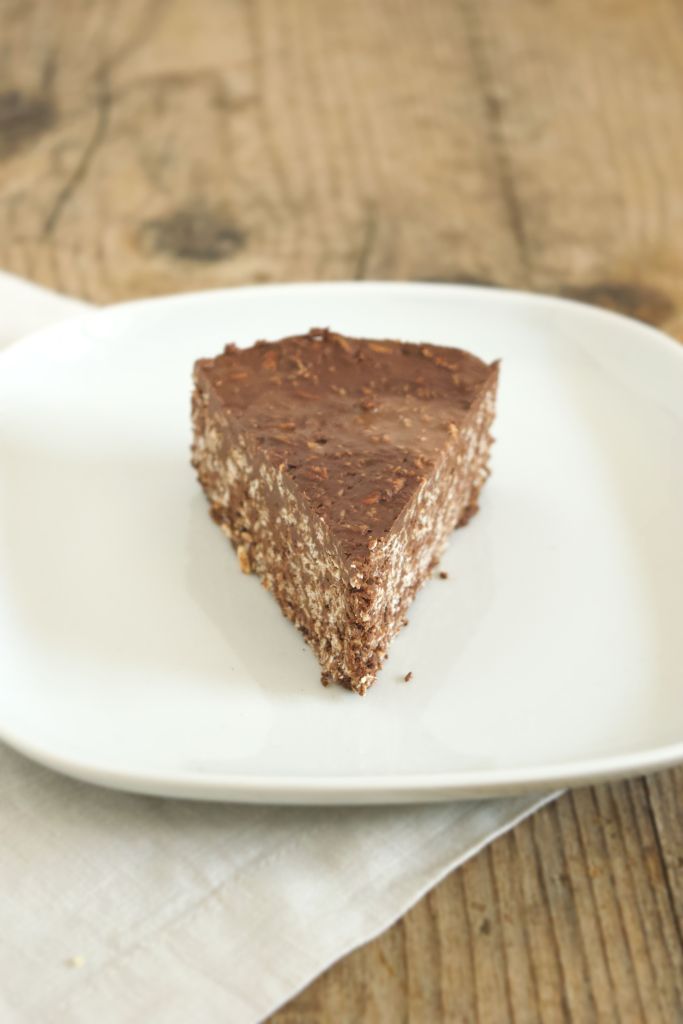 Trasferite in uno stampo per torte con cerniera (18-20cm diametro). Livellate bene. Fate indurire in frigorifero almeno 6 ore – meglio tutta la notte.